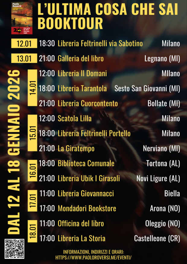 Che settimana che mi si prospetta! Come sai il 13 gennaio arriva il nuovo romanzo L’ultima cosa che sai (Marsilio) e questi sono i miei impegni dei primi 7 giorni. Ci vediamo?Trovi tutti gli indirizzi e gli orari qui.Io e Radeschi ti aspettiamo!
