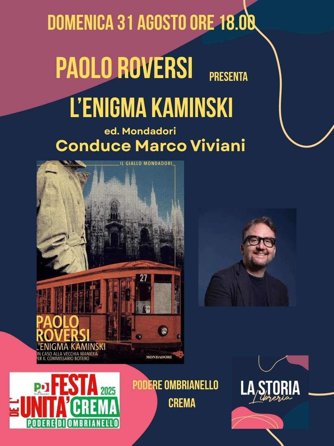 Domenica 31 agosto alle ore 18:00 presenterò a Crema(CR) il mio romanzo “L’enigma Kaminski” (Mondadori).