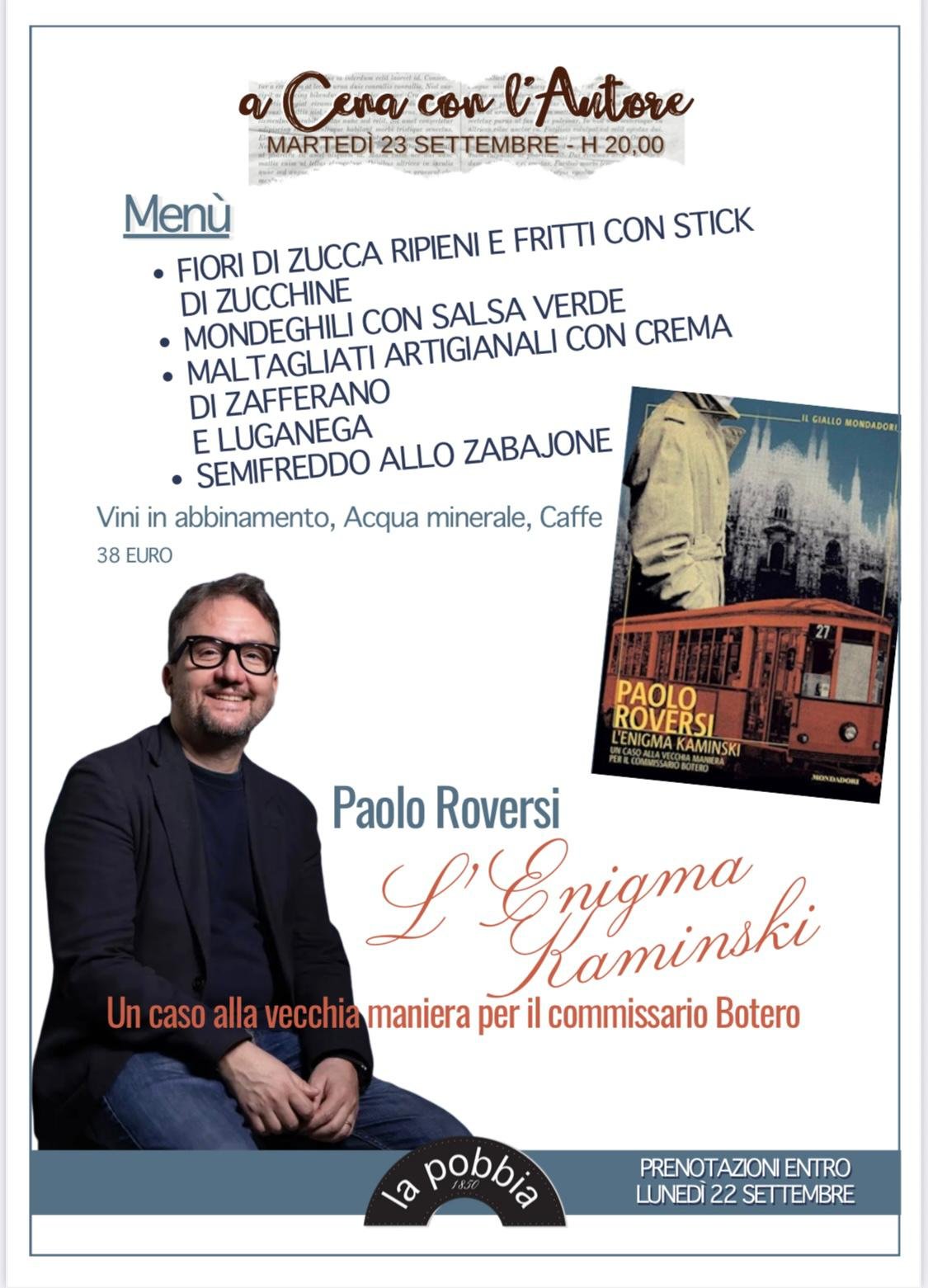 Martedì 23 settembre alle ore 20:00 presenterò il mio romanzo “L’enigma Kaminski” (Mondadori) durante la cena d’autore al ristorante La Pobbia a Milano.